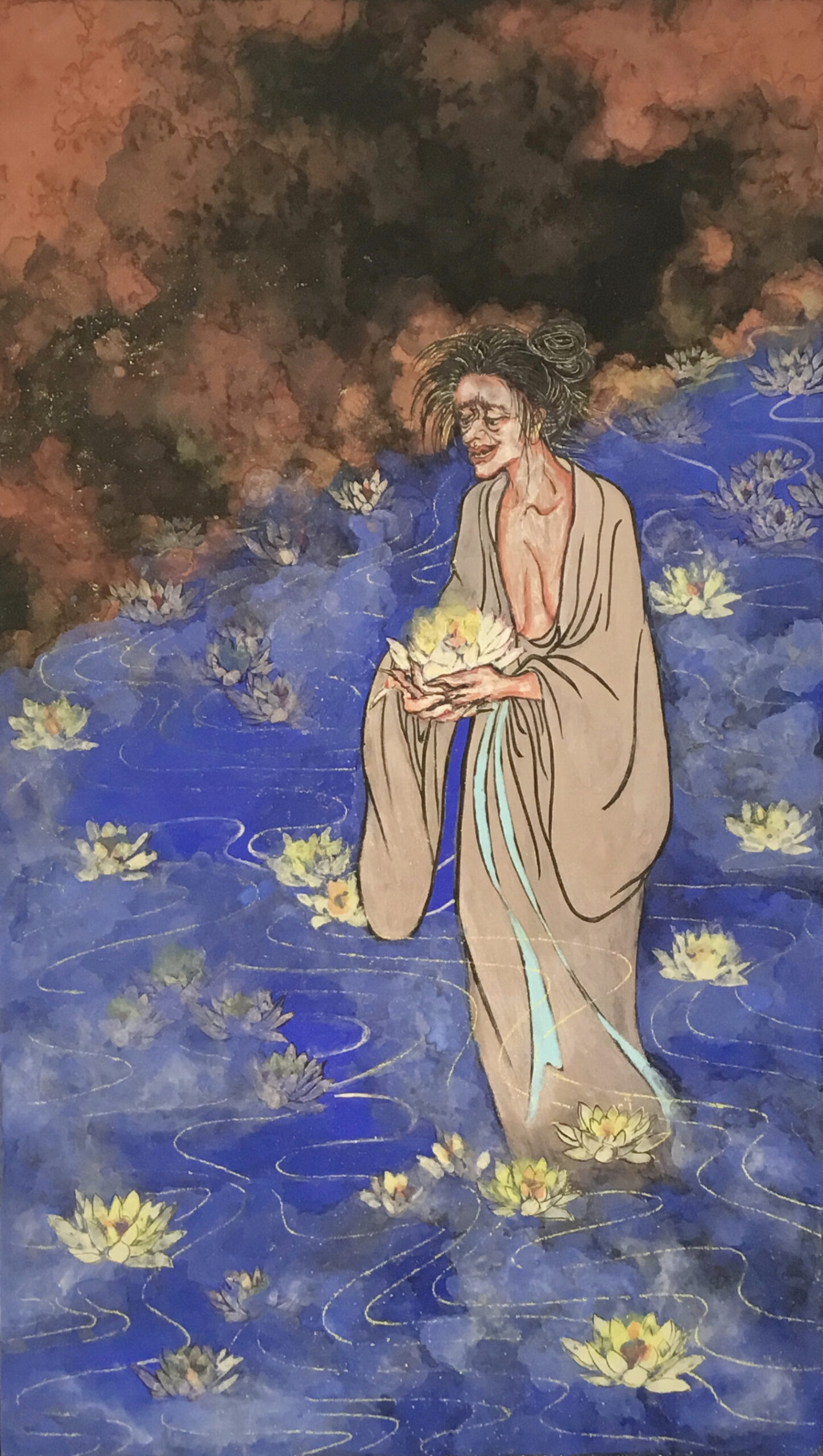 麻紙、岩彩、胡粉、水干、墨流技法等